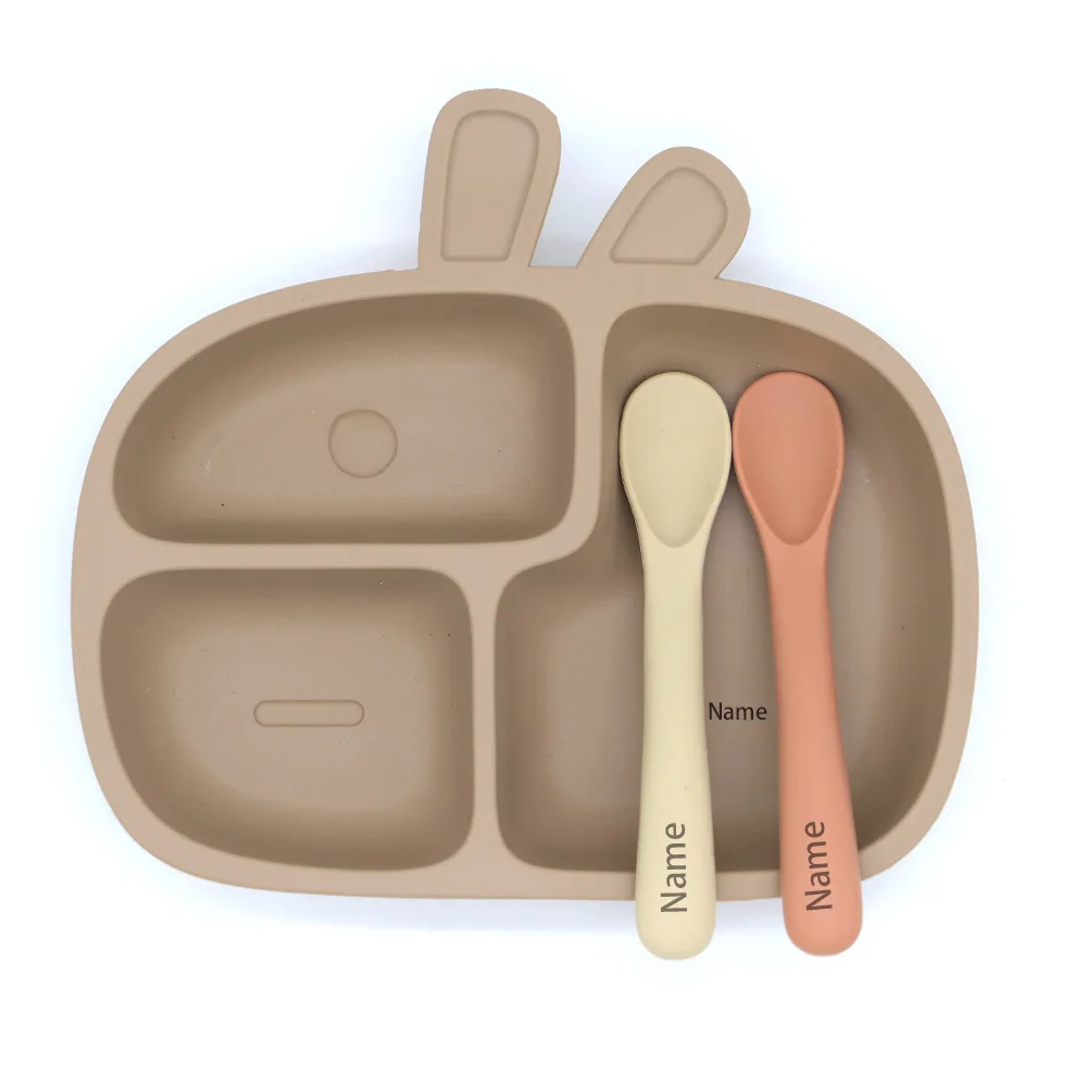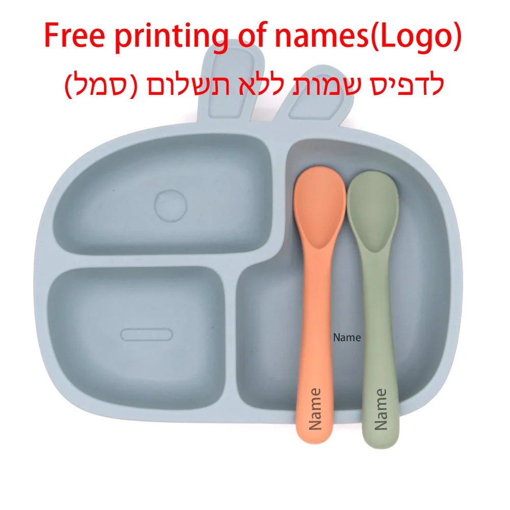 Conjunto de Louça Infantil com Impressão de Nome Grátis: Tigela, Colher, Garfo em Silicone