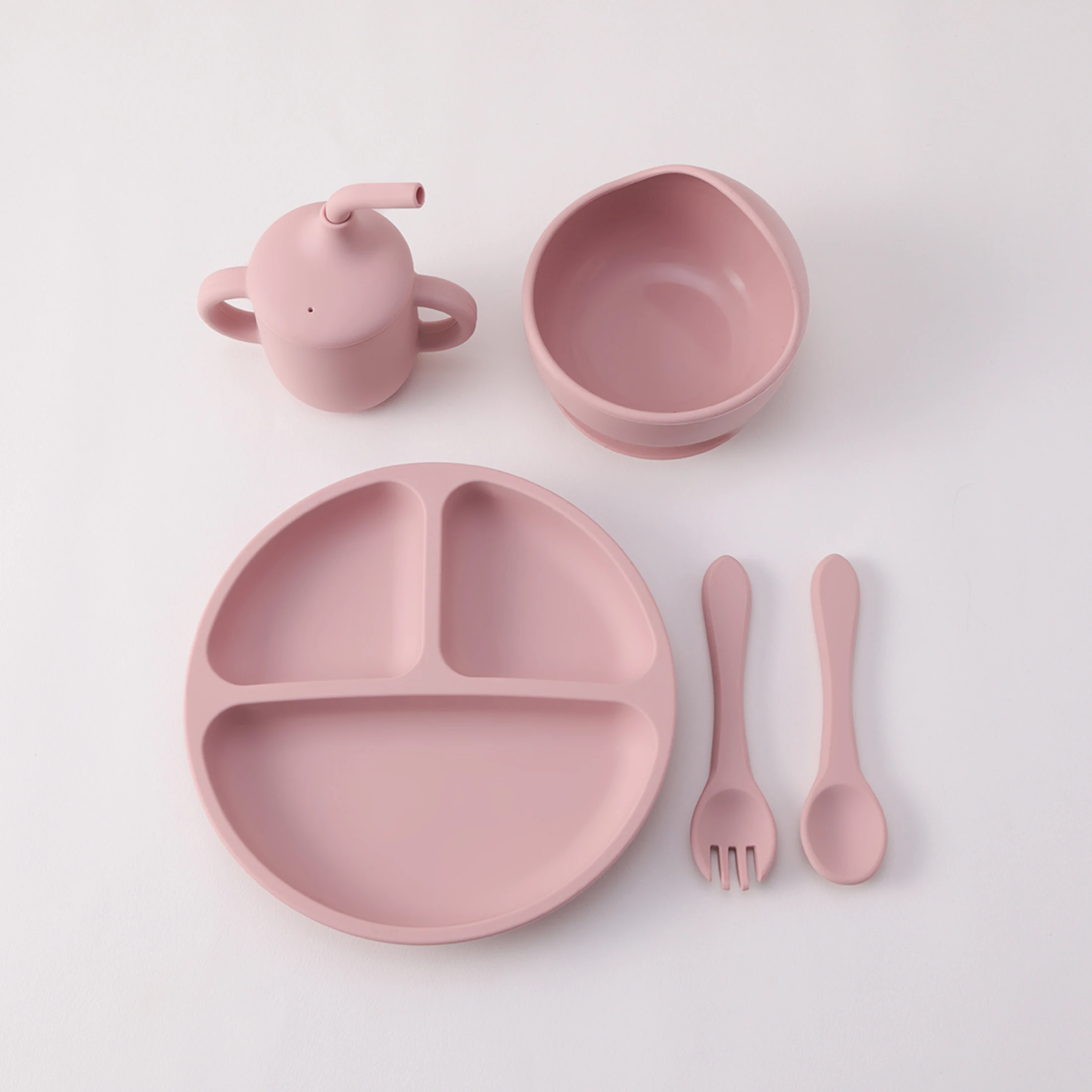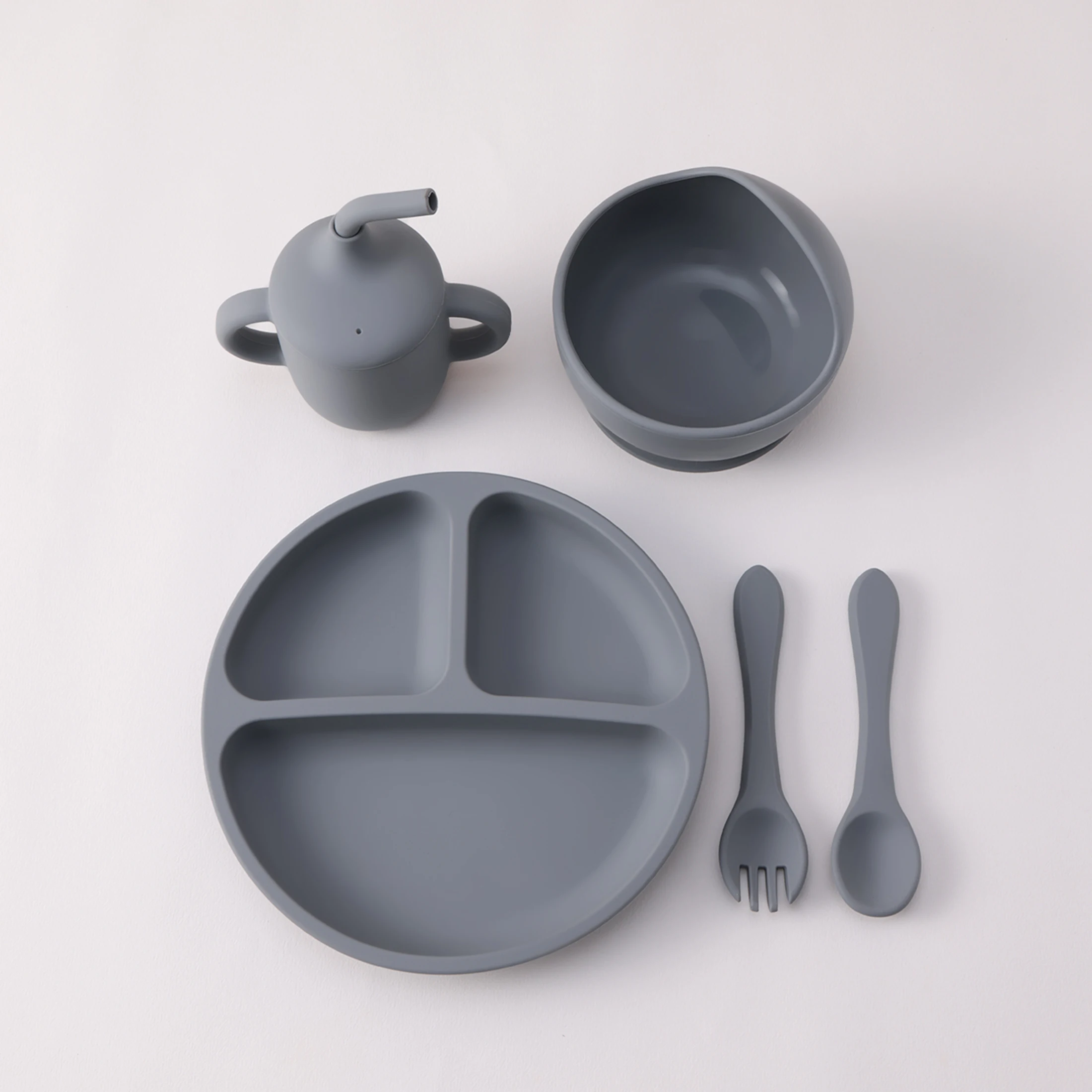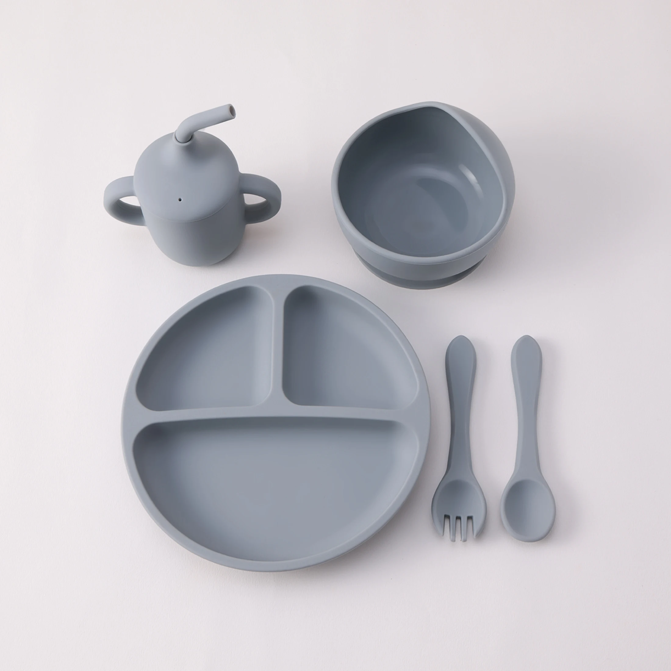 Cor crianças 5 pçs silicone conjunto de alimentação do bebê tigela de sucção placa com colher garfos bpa livre utensílios de aprendizagem utensílios de refeição