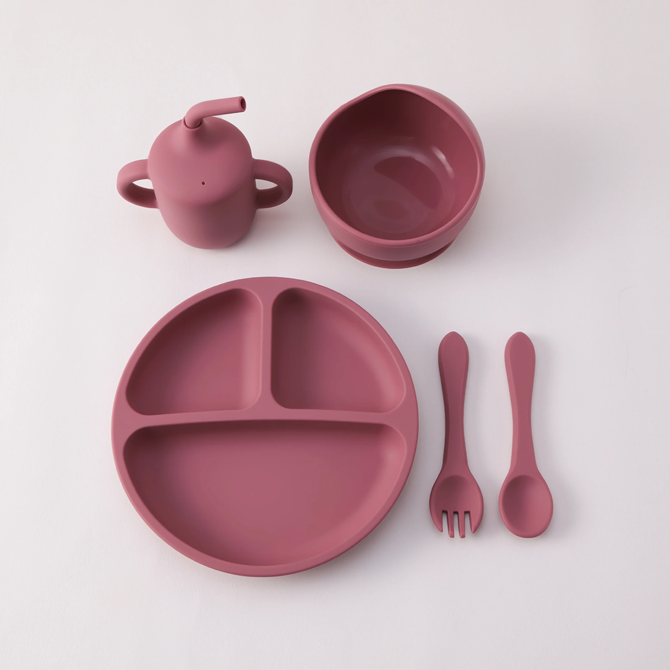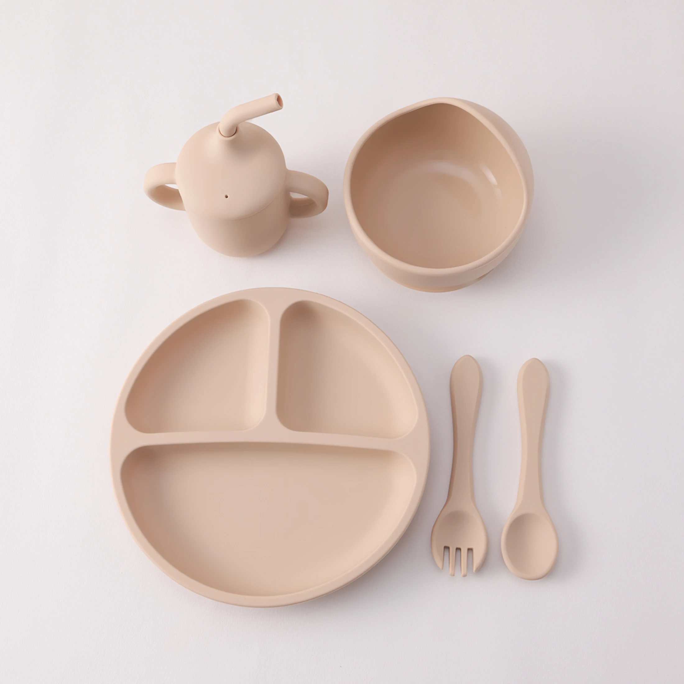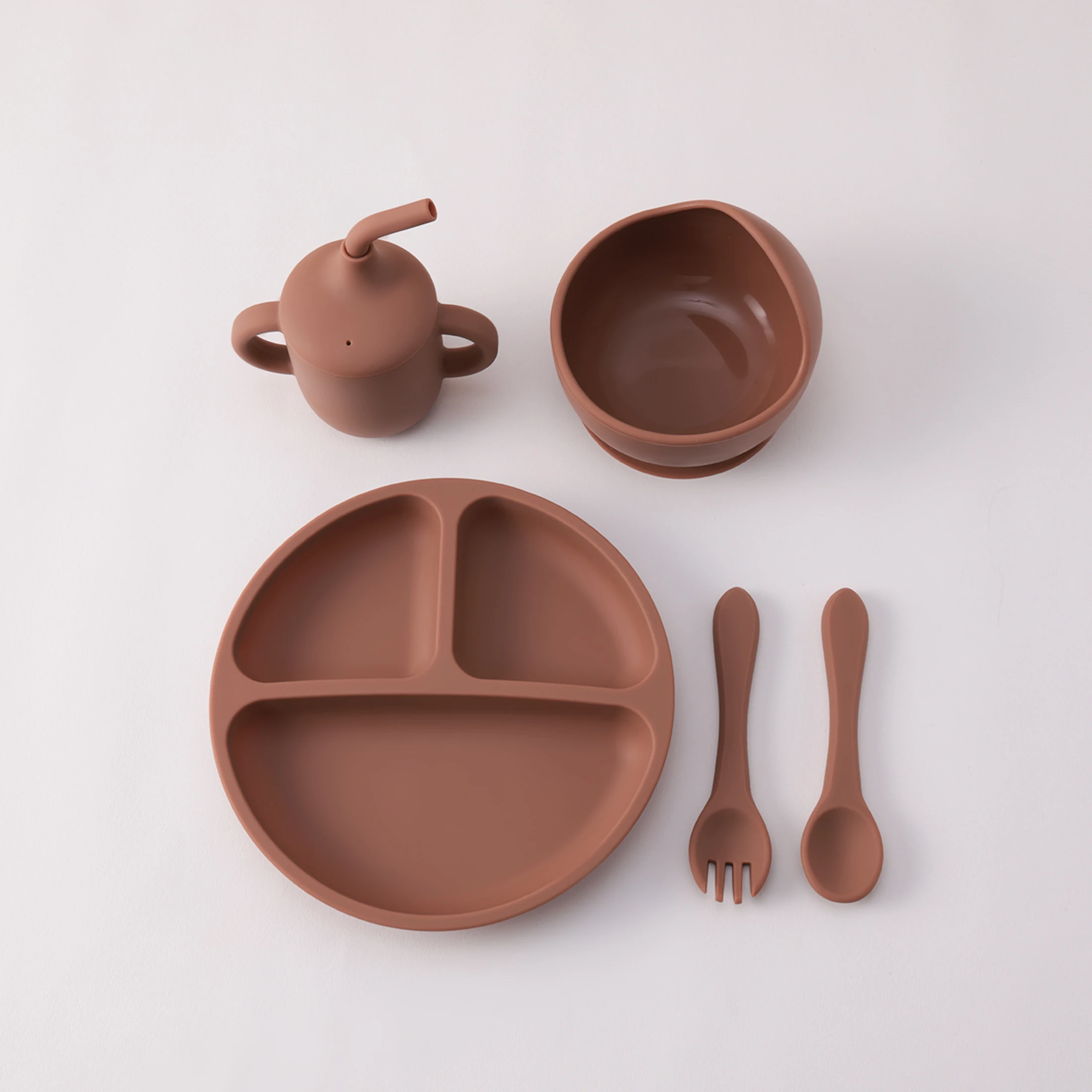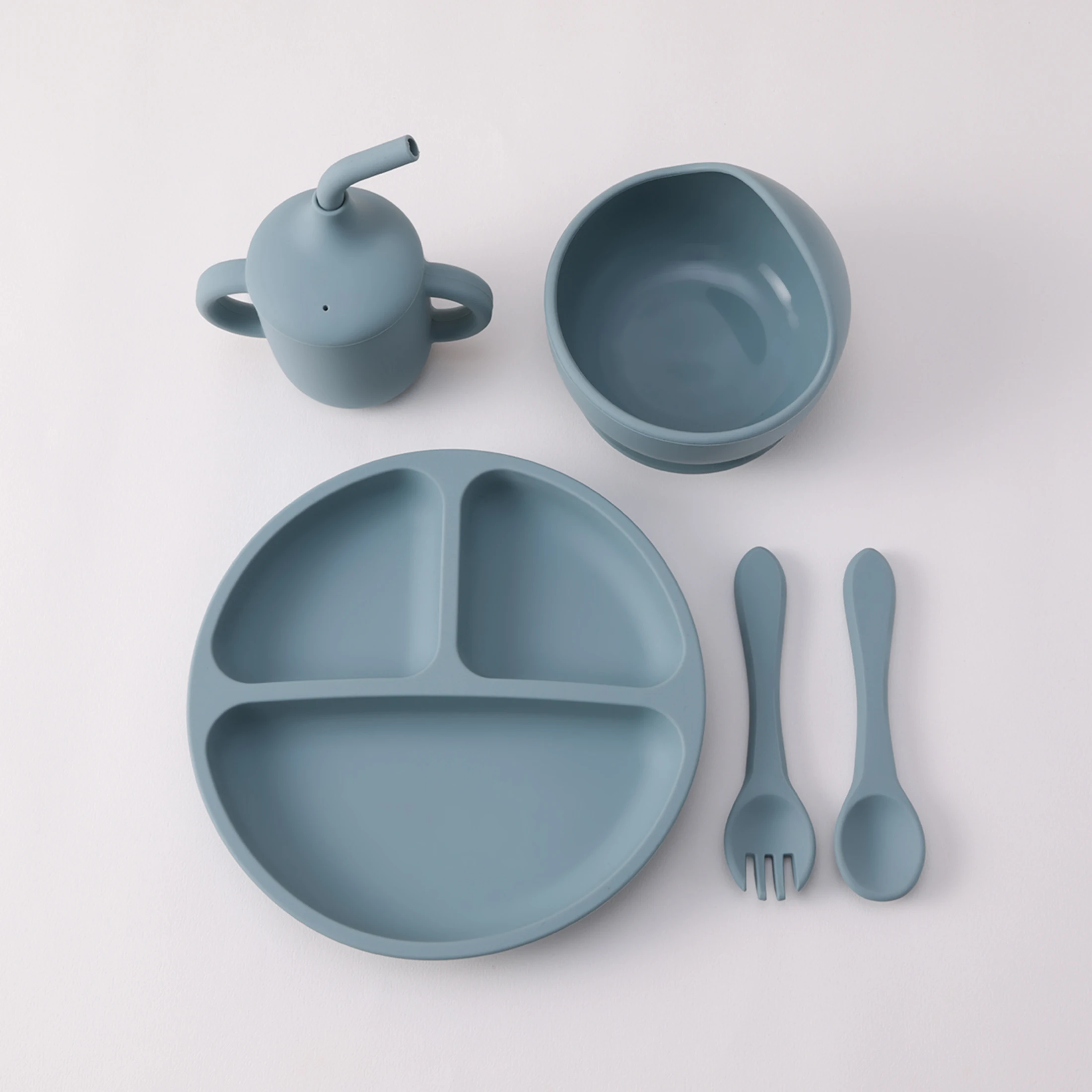 Cor crianças 5 pçs silicone conjunto de alimentação do bebê tigela de sucção placa com colher garfos bpa livre utensílios de aprendizagem utensílios de refeição