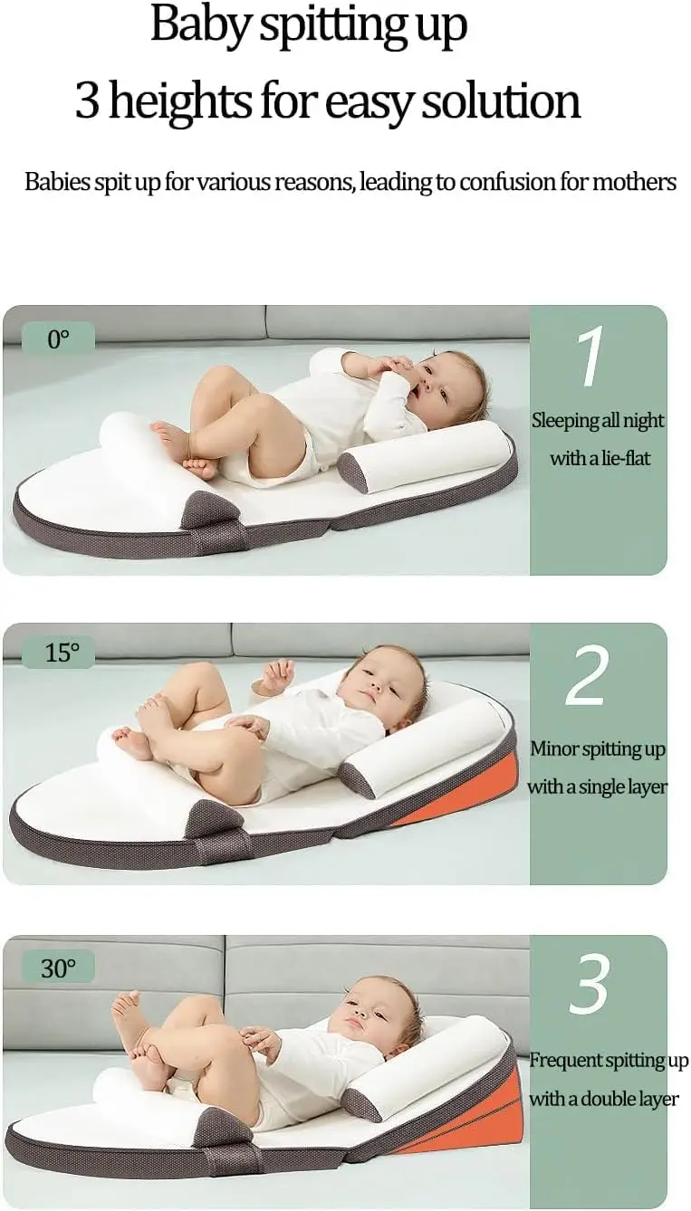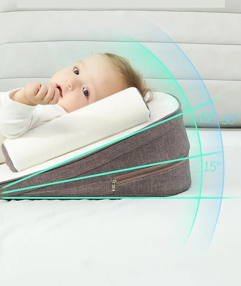 Nosso travesseiro para bebês de 0 a 3 anos com 30, 15, 0 três níveis de ajuste de altura, que pode lidar com precisão com diferentes graus de refluxo infantil e ajudar bebês a comer e descansar melhor.