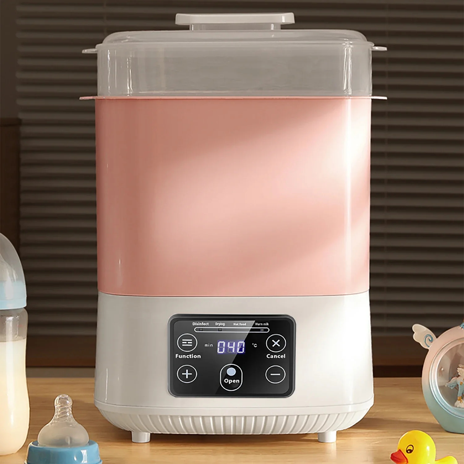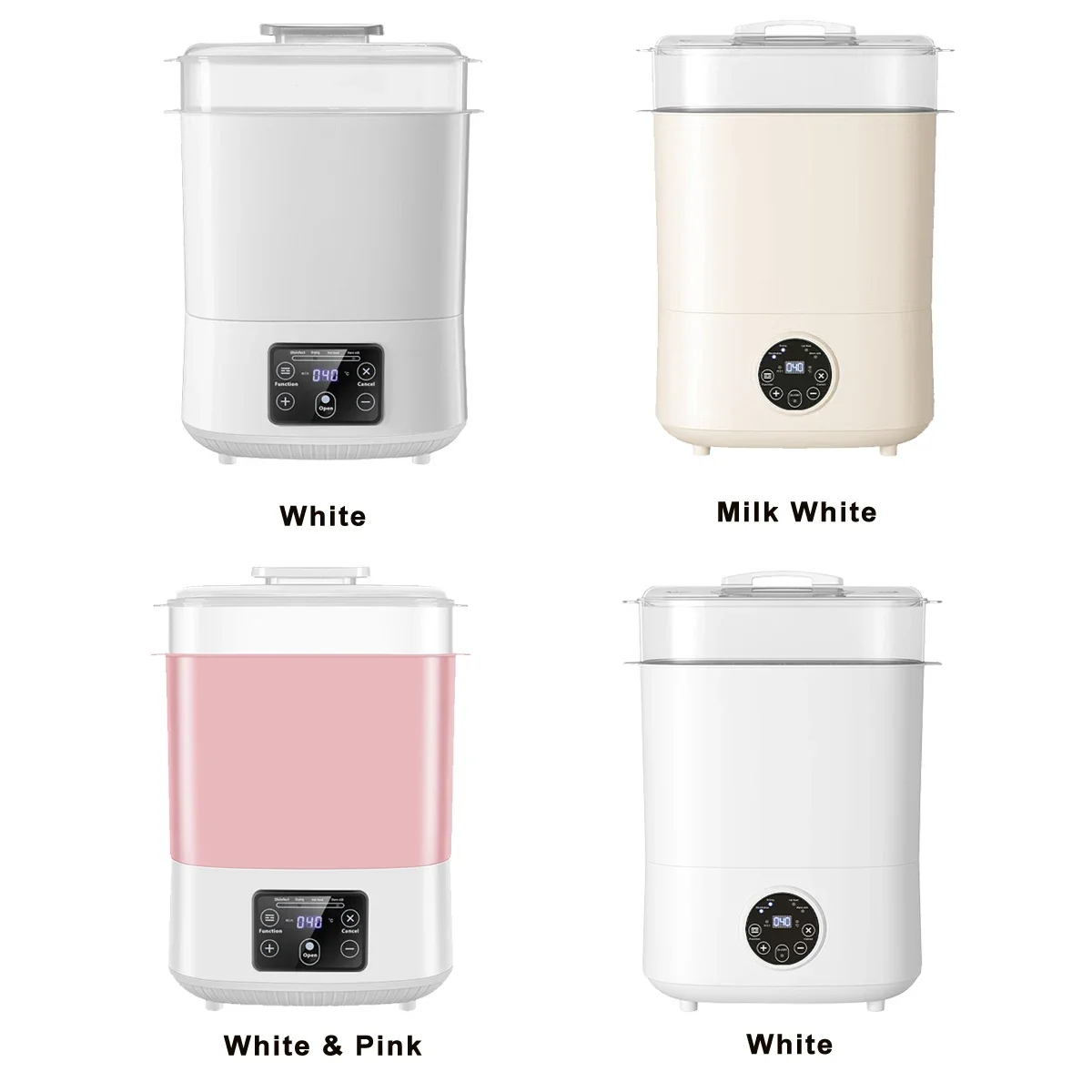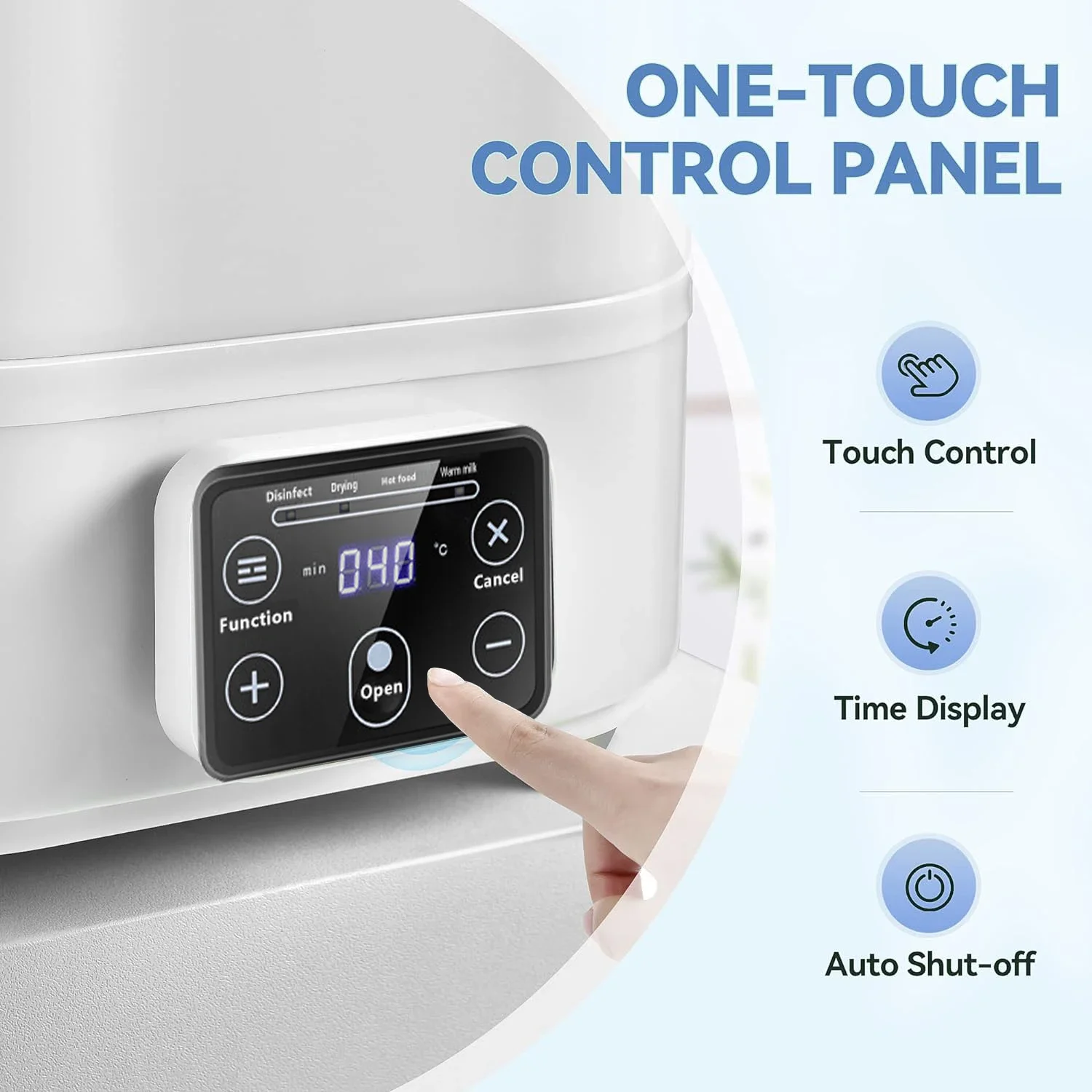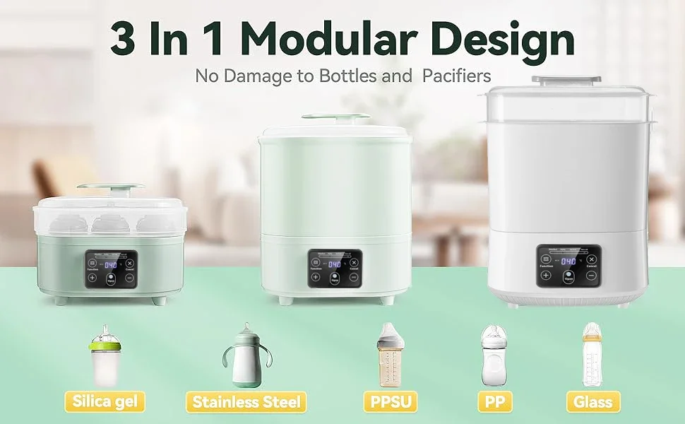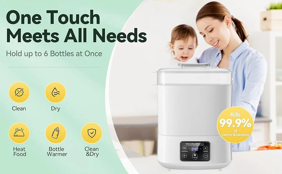 Nome do produto: Bebê Alimentação Garrafa Aquecedor & Esterilizadores & Secador Aquecedor Elétrico Vapor Garrafa Sanitizer Grande Garrafa Steamer com Tela Sensível Ao Toque Tamanho: 27*18*37cm / 10.63*7.09*14. Frequência de tensão nominal: 200-240V Frequência nominal: 50Hz Potência de aquecimento: 350W Potência de secagem: 180W Característica: 1 99,99% esterilização: 300w aquecedor de cerâmica de alta potência faz o esterilizador de mamadeira e secador tem um vapor de temperatura mais elevada do que a máquina de lavar louça, apenas uma hora para afastar 99,99% dos "bandidos" e secagem completa. 2 avançado 24 horas de manutenção inteligente: o esterilizador de mamadeira seca uma vez a cada 3 horas após a esterilização estar completa por 24 horas, para que a mamadeira esteja limpa e seca sempre que você precisar. 3 6 em 1 multi-função: esperamos que cada nova mãe pode fazer o que ela quer fazer com o mínimo de esforço. Colocando garrafas e peças em esterilizador de mamadeira e secador, você pode conseguir esterilizar apenas, secar apenas 4, manter inteligente 24 horas, 1 hora auto esterilizar e secar, pré-definido esterilizar e pré-definido seco. 4 conduziu o painel de controle inteligente: este é nosso projeto mais vantajoso. Opere com o controle do toque na maneira a mais intuitiva. A luz é clara e pode ser usada facilmente à noite. 5 espaço maior: esterilizador e secador para mamadeiras tem um design de camada dupla para ajudar a classificar mamadeiras e acessórios. A camada inferior tem um grande espaço para seis garrafas, e a camada superior é usada para chupetas e outros acessórios. Cuidado: Verifique se a tensão indicada no aparelho corresponde à tensão da rede local antes de conectar o aparelho. Não inicie a esterilização se não houver água na placa aquecedora de aço inoxidável. Ou pode causar danos ao aparelho. Certifique-se de derramar cerca de 100ml de água na placa aquecedora de aço inoxidável antes da esterilização. Não cubra a ventilação na tampa durante a operação. A tampa do aparelho fica quente durante a operação ou logo após a operação e pode causar queimaduras se for tocada. O vapor quente que sai da ventilação na tampa ou quando a tampa é aberta pode causar queimaduras. Não se aproxime disso. Não mova o produto ou abra a tampa quando estiver em uso. A placa aquecedora de aço inoxidável fica quente durante a operação ou logo após a operação e pode causar queimaduras se for tocada. Não permita que as crianças brinquem com o aparelho.