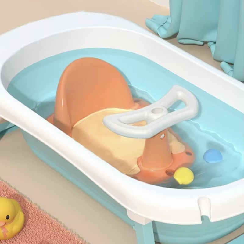 Essa cadeira de banho de bebê têm braços e enconto alto para que o bebê seja suficientemente apoiado de forma confortável.