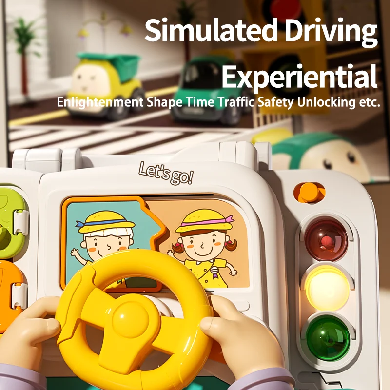 [Semáforo]: Ilumine as crianças para conhecer o bom do trânsito e distinguir os semáforos. Simule a rotação do volante para a esquerda e para a direita.