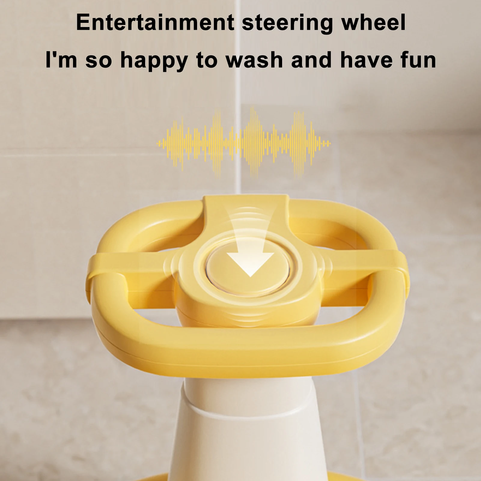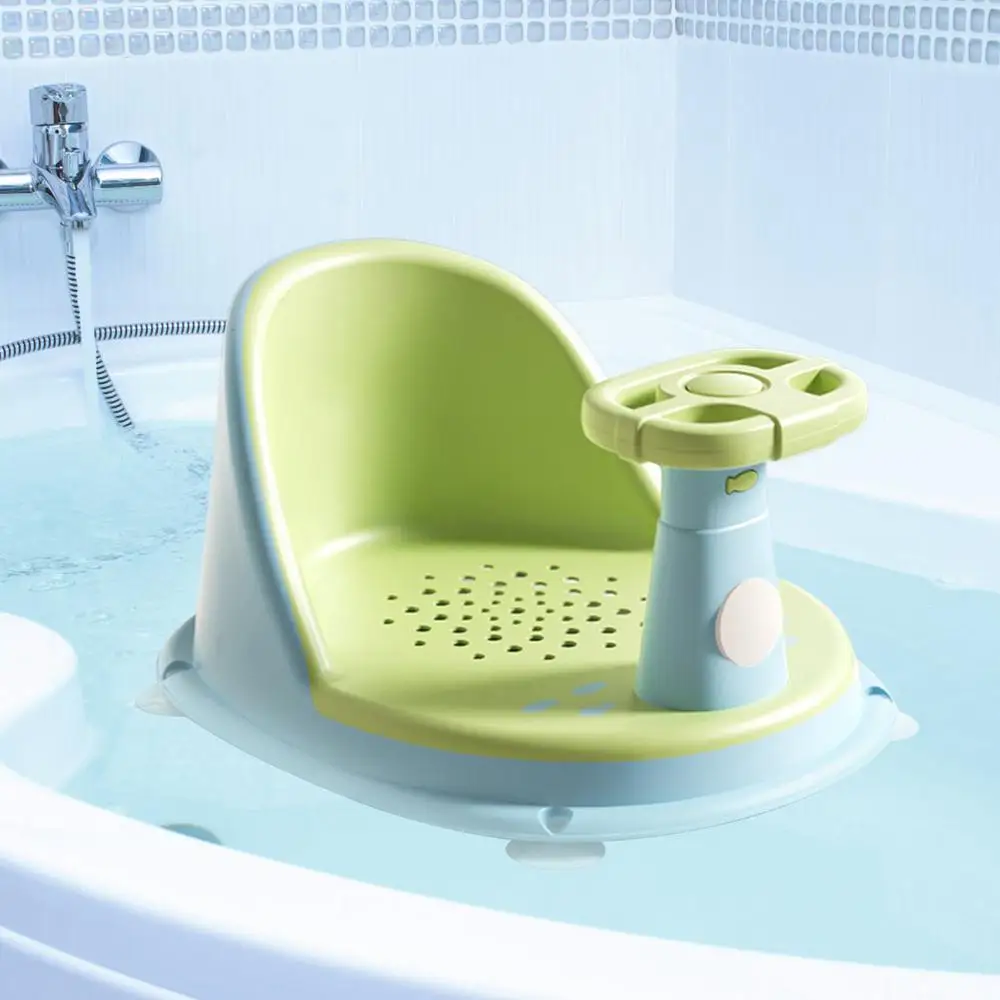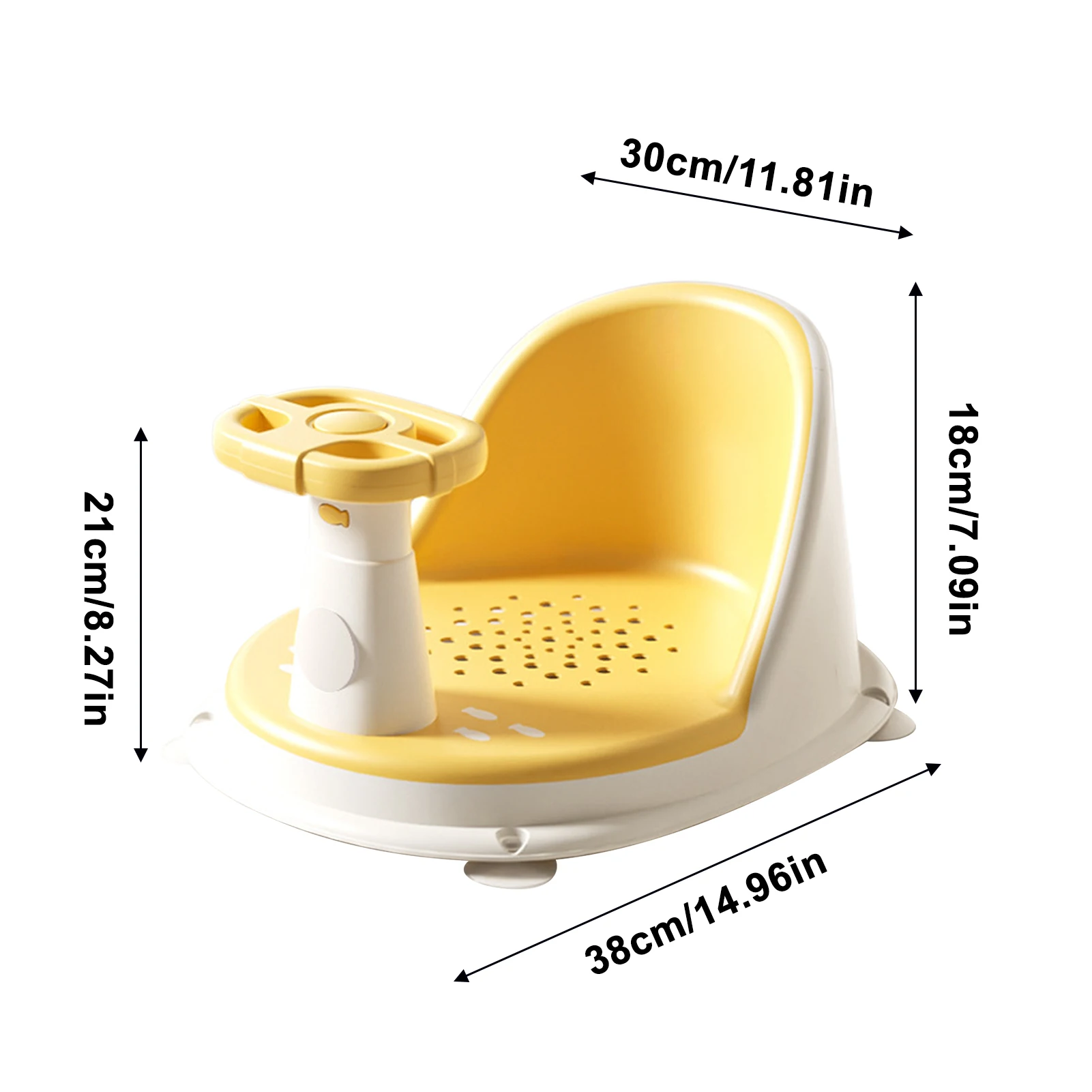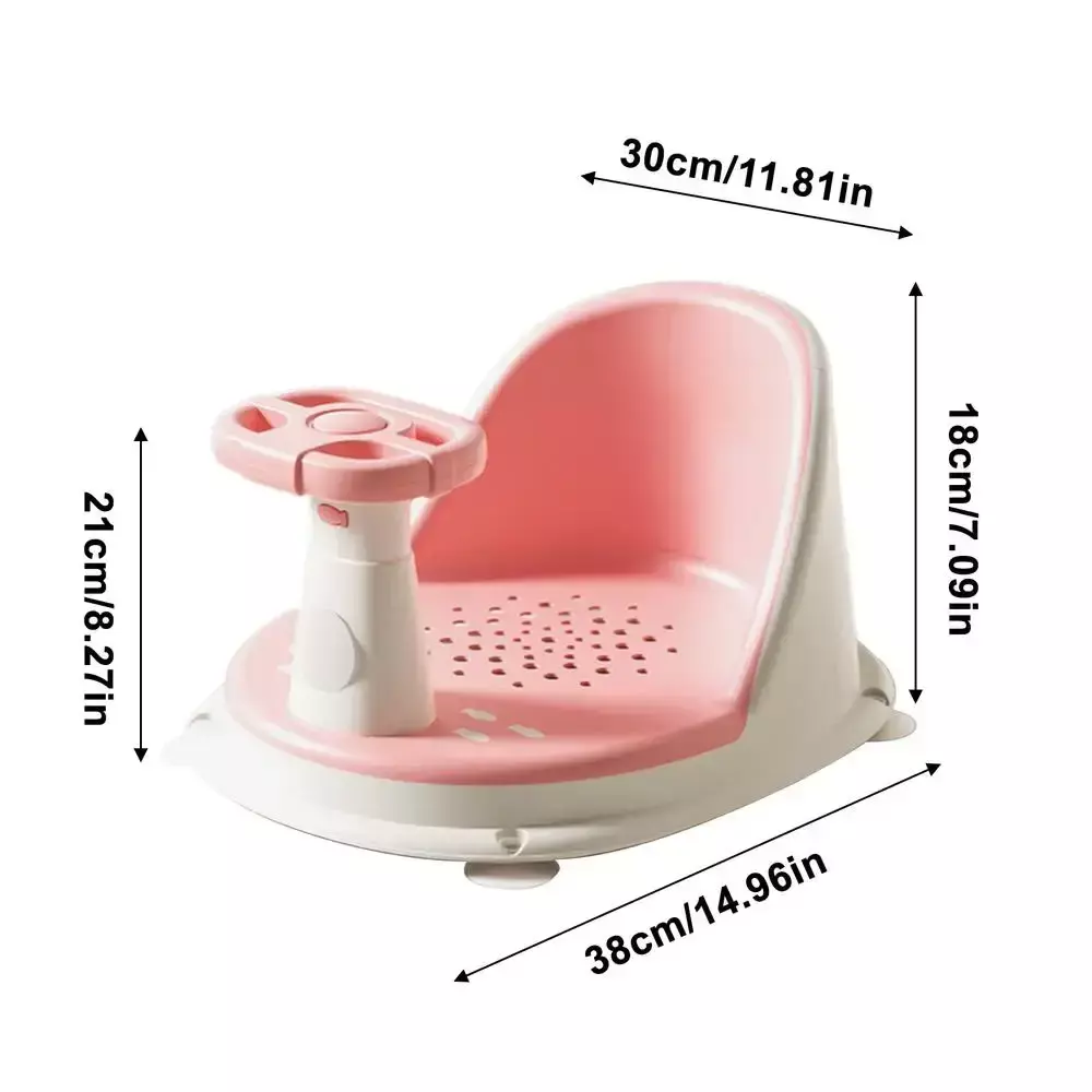 2.Hora do banho focada na diversão: esta cadeira de banho para bebês possui um pequeno volante projetado para desviar a atenção por meio de diversão interativa, permitindo que os bebês apertem e emitam sons, promovendo a brincadeira e a interação, ao mesmo tempo que torna a hora do banho agradável e envolvente para o seu filho