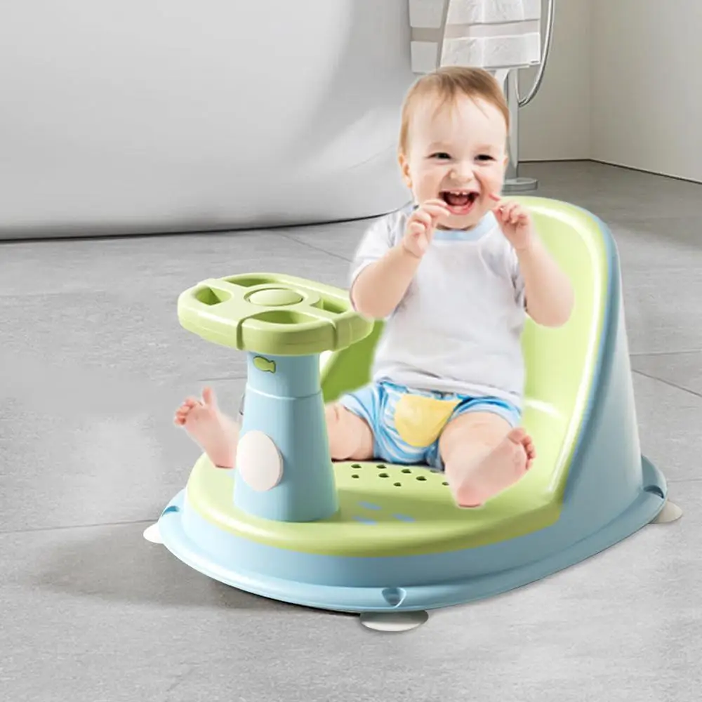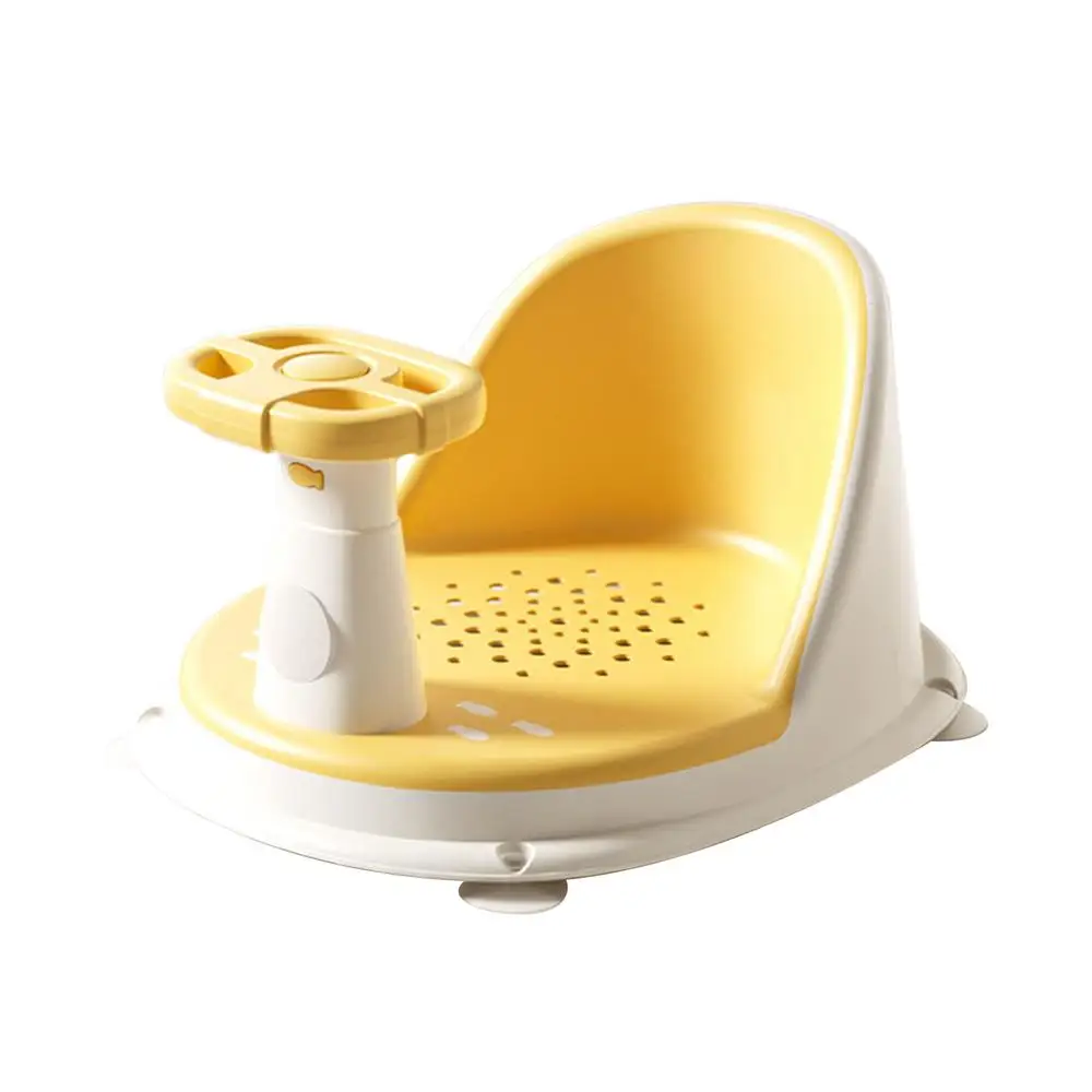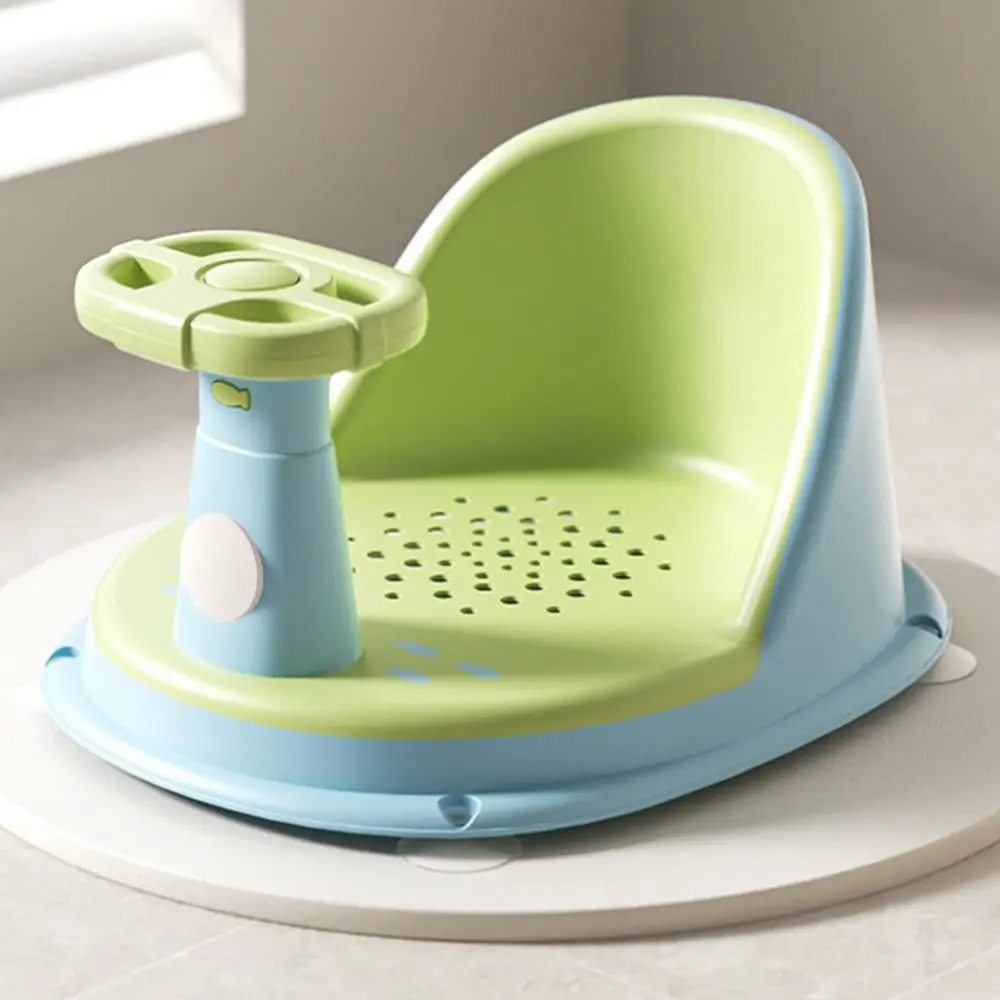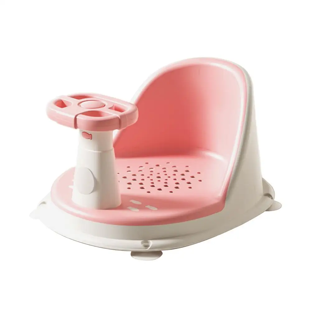2.Hora do banho focada na diversão: esta cadeira de banho para bebês possui um pequeno volante projetado para desviar a atenção por meio de diversão interativa, permitindo que os bebês apertem e emitam sons, promovendo a brincadeira e a interação, ao mesmo tempo que torna a hora do banho agradável e envolvente para o seu filho