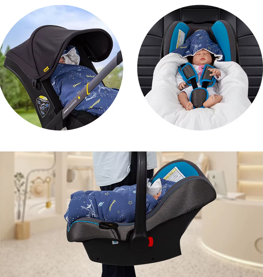 3 maneiras de usar: cobertor de transporte infantil; cobertor de carrinho; cobertor de embrulho