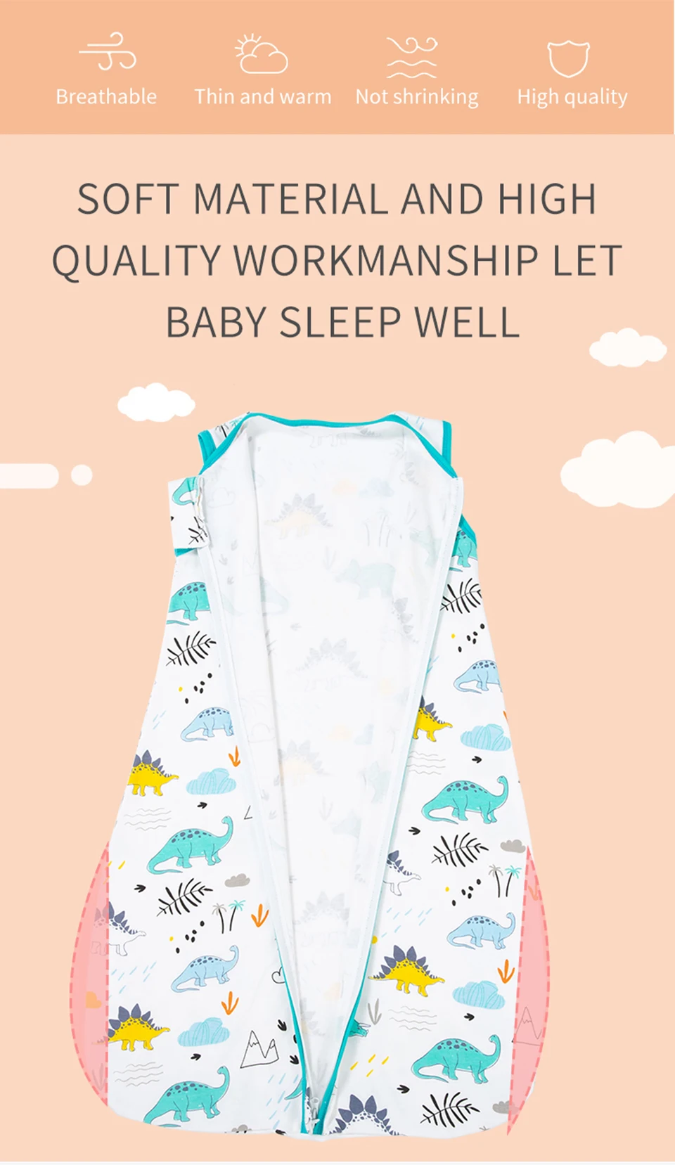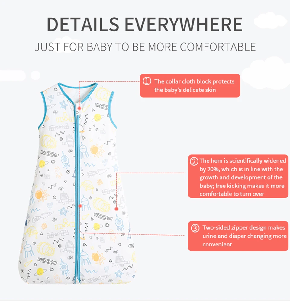 O algodão utilizado é macio e suave, perfeito para a pele sensível do bebê, proporcionando um toque confortável que evita irritações e alergias. Além disso, o design ergonômico do saco de dormir permite que o bebê tenha liberdade de movimento enquanto dorme, sem comprometer a segurança. Isso significa que ele pode se mexer à vontade, mas sem se expor ao risco de se descobrir durante a noite, como acontece com cobertores tradicionais. 🌞