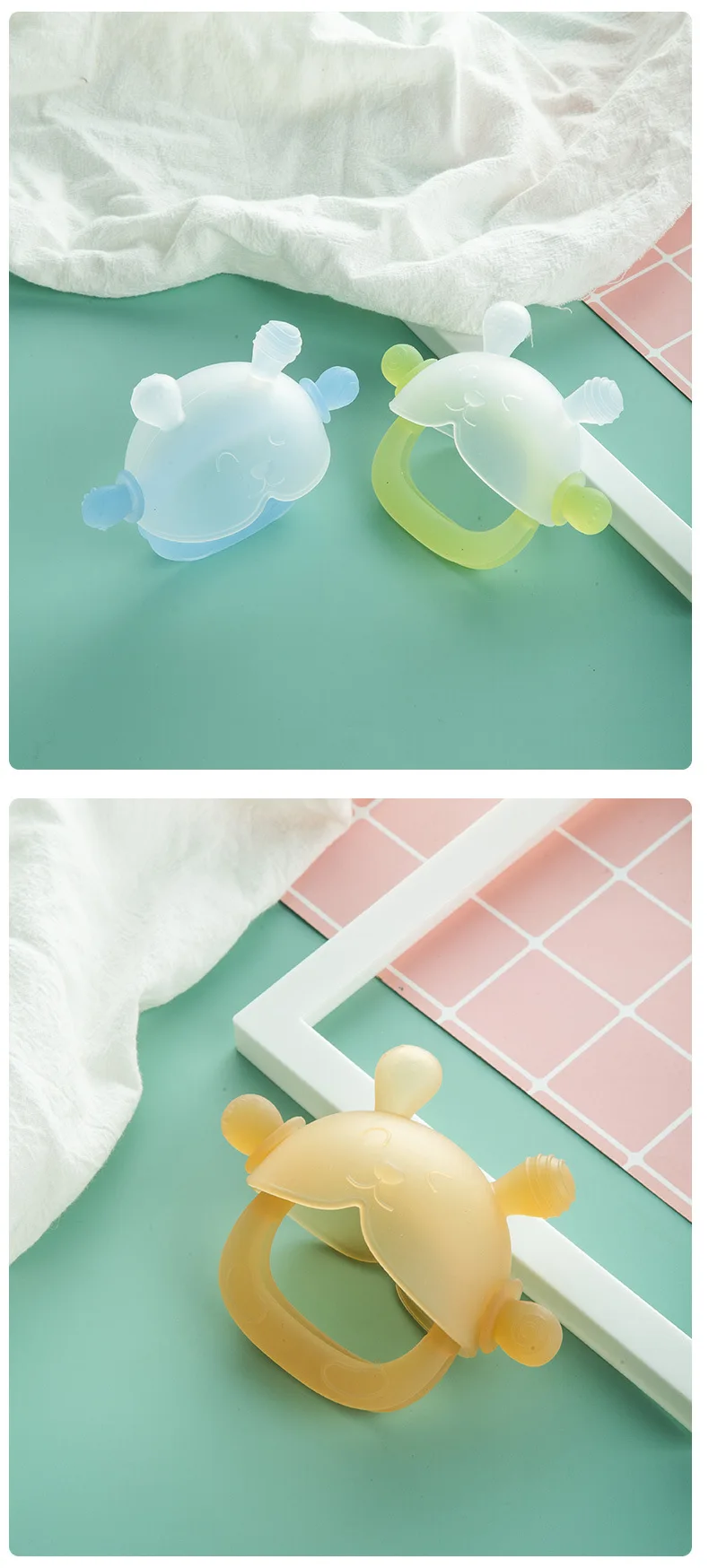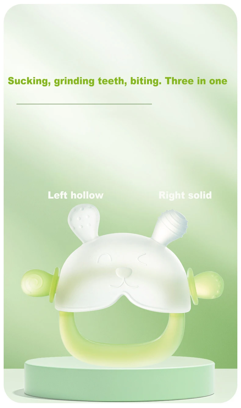 Do silicone de qualidade alimentar ao bebê macio, é mais adequado para bebês com mais de 2 meses de idade.Estas chupetas podem ajudar os bebês a mastigar e ajudá-los a adormecer.