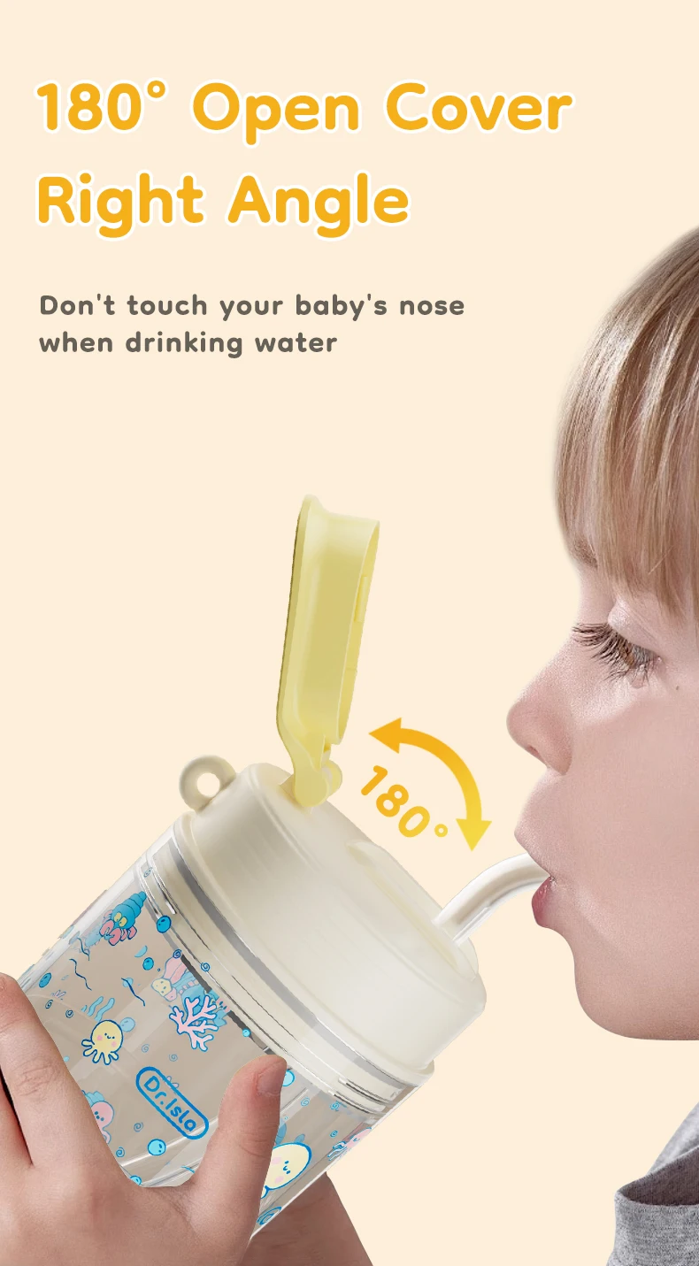 Projetado com um 180° tampa vertical que fica fora do caminho, para que seu filho possa beber confortavelmente sem bater no nariz.Incentiva uma bebida segura e independente!