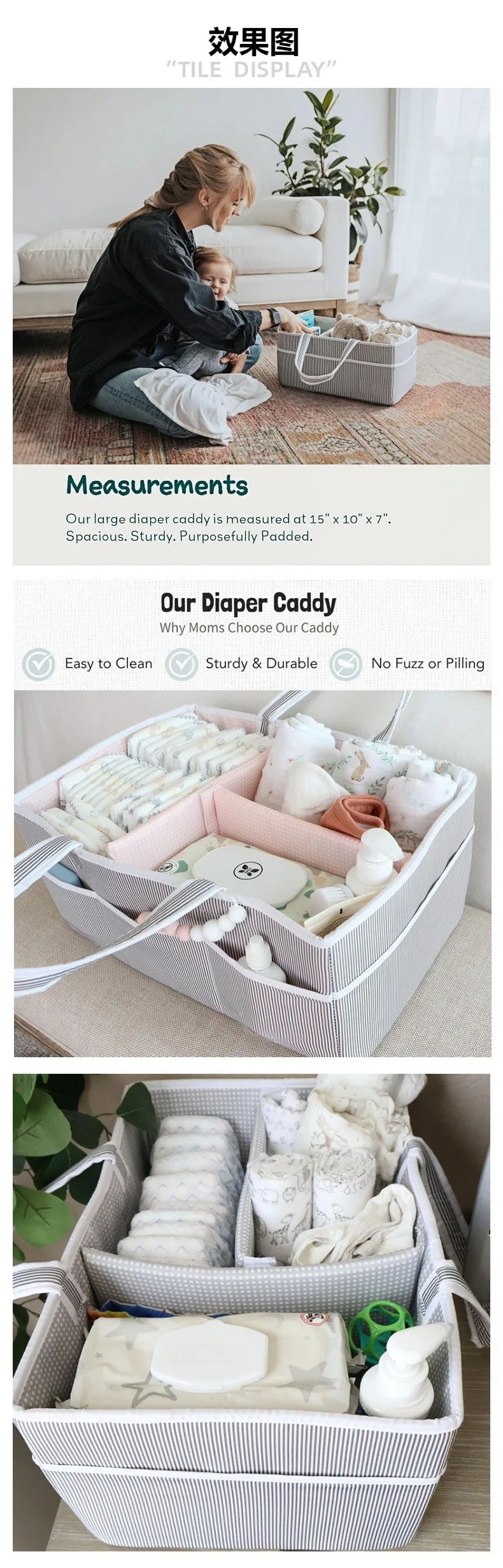 Fibra de poliéster- feito com tecidos de alta qualidade.Toque suave, alto padrão, incluindo divisória removível, você pode montar fraldas, lenços umedecidos, loção, brinquedos e outras necessidades de fraldas.